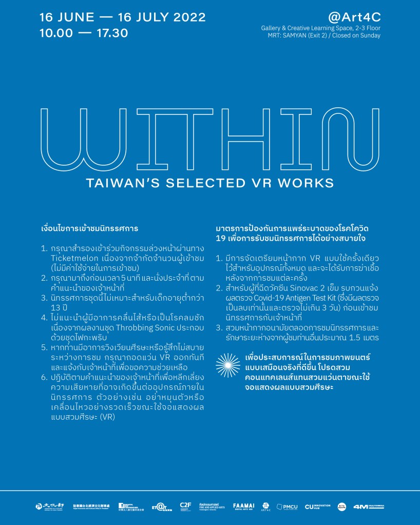 นิทรรศการ “WITHIN_Taiwan’s Selected VR Works” เป็นการทำงานครั้งแรกระหว่าง ศูนย์ปฏิบัติการศิลปกรรมดิจิทัล(FAAMAI) ศิลปกรรมศาสตร์ จุฬาลงกรณ์มหาวิทยาลัย และมูลนิธิศิลปะดิจิทัล (Digital Art Foundation) ซึ่งจุดประสงค์ของทั้ง 2 องค์กรต่างมีจุดประสงค์เดียวกัน คือ ส่งเสริมการทำกิจกรรมศิลปะดิจิทัล ช่วยในการพัฒนาอุตสาหกรรมศิลปะดิจิทัล และยกระดับชีวิตเกี่ยวกับศิลปะดิจิทัลในสังคม จึงเกิดเป็น นิทรรศการครั้งนี้ขึ้น