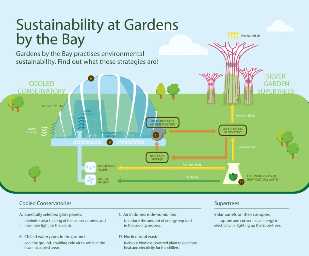 เริ่มจากการดูฟังก์ชั่นโดยรวมของ Gardens by the Bay เพราะเป็นระบบหมุนเวียนที่ช่วยให้ Flower Dome ยังคงความเย็น โดยการมีท่อน้ำลำเลียงความเย็นอยู่ด้านล่าง และ ใช้พลังงานอย่างยั่งยืนในพื้นที่ทั้งหมด รวมถึงการใช้พลังงานจากแสงอาทิตย์ผ่าน Supertree
